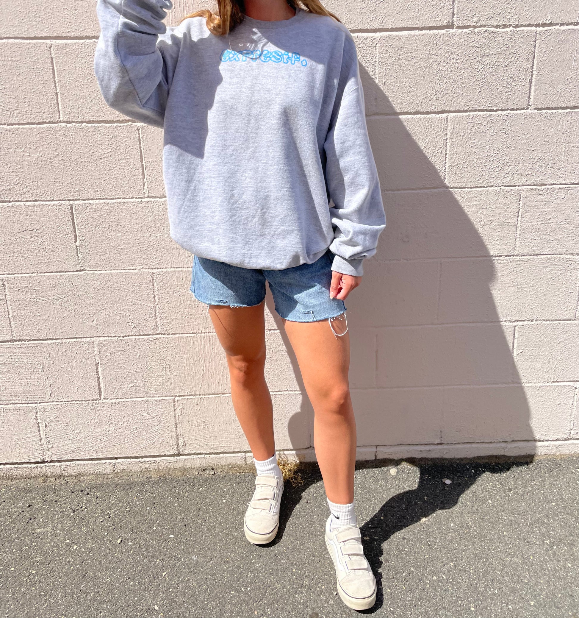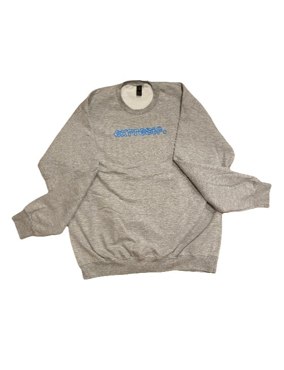 75% cotton, 25% polyester, grey Gildan crewneck. Light blue Screen print on front and back.